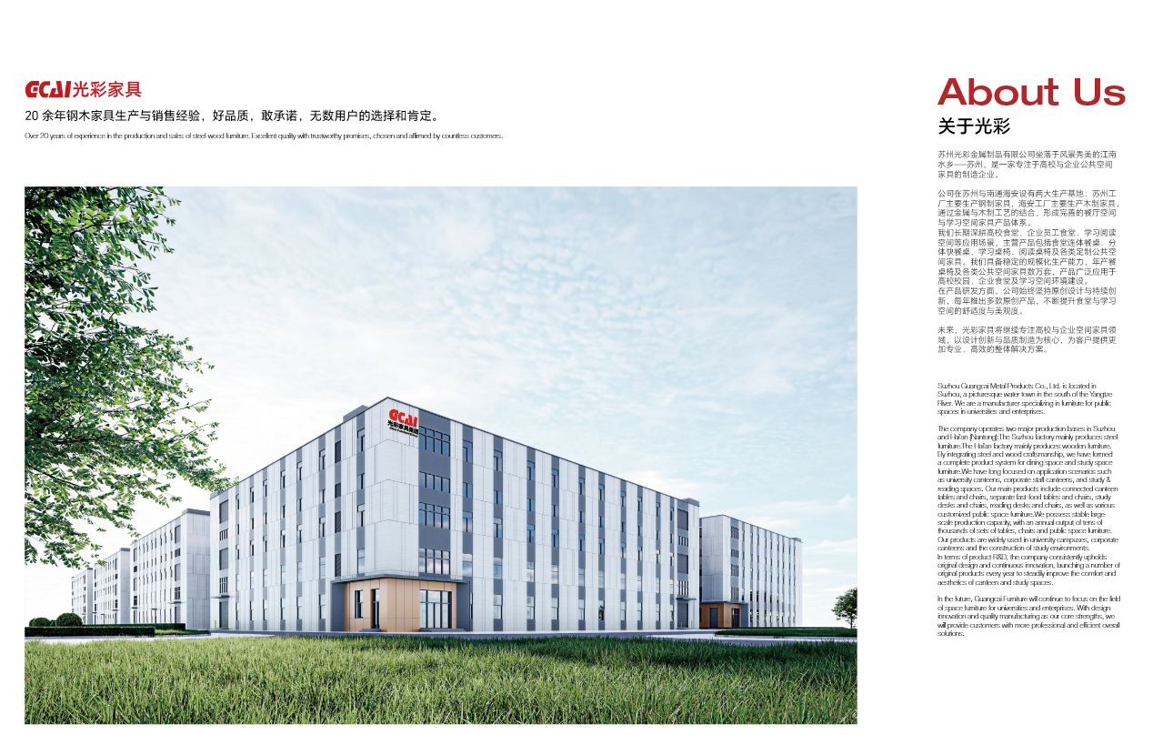 Suzhou Guangcai Metal Products Co., Ltd. adalah produsen profesional yang berfokus pada perabot ruang publik untuk universitas, kampus perusahaan, kantin karyawan, dan area belajar. Perusahaan menyediakan solusi terintegrasi yang mencakup desain, produksi, penyesuaian (customization), serta dukungan purna jual.